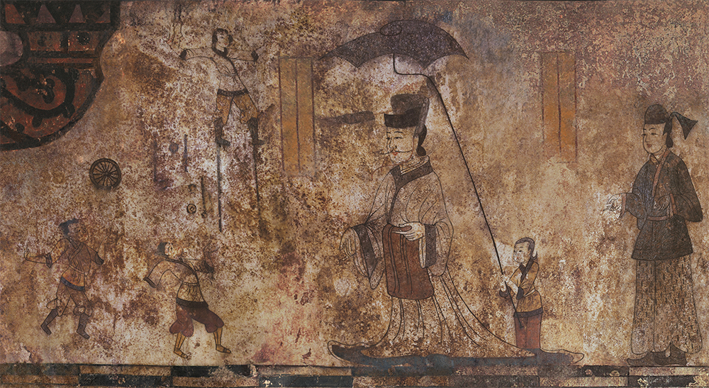 남벽은 널방의 입구 부분으로 좌우의 동벽과 서벽에 벽화가 그려졌다. 입구 양편으로 검은 모자를 쓰고 황색포를 입은 남자들이 무덤의 입구를 지키듯 서로 마주보고 나란히 서 있는 모습이 확인된다. 일산은 대가 구부러지고 둥근 테두리가 있는 꽃잎모양의 장식을 달아 만들었다. 벽화의 여백에는 구름무늬가 그려져 있다.